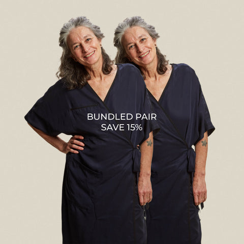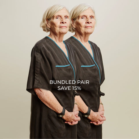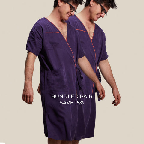 2 pack of robes allowing one to be laundered while the other is in use. Features exquisitely soft and breathable fabric in a reversible kimono design that provides luxury without compromising function in hospital, recovery and beyond. Hidden tear away shoulder seams allow for easy medical access. Overlapping panels ensure full coverage at all times. The wrap detailing provides choice to wear a form-fitted style one day and a more casual fit the next.