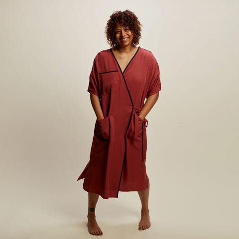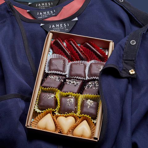 Comfort Combo - one Janesi Comfort Gown and one assorted box of Lagusta's Luscious artisan confections. Features exquisitely soft and breathable fabric in a reversible kimono design that provides luxury without compromising function in hospital, recovery and beyond. Hidden tear away shoulder seams allow for easy medical access. Overlapping panels ensure full coverage at all times. The wrap detailing provides choice to wear a form-fitted style one day and a more casual fit the next.